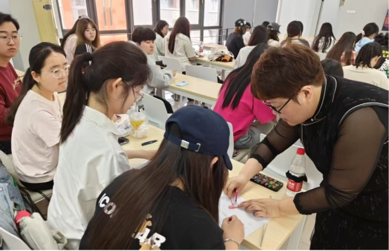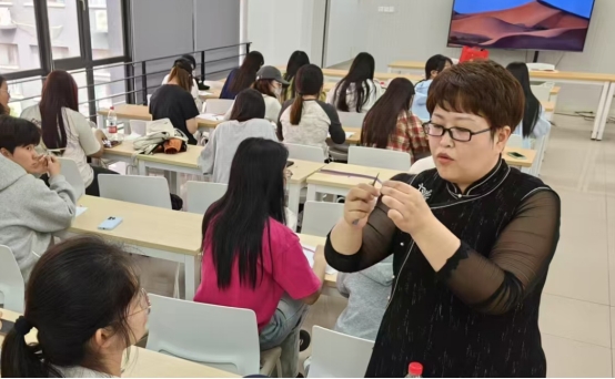 在传承手操实践环节,津派旗袍第四代传承人江艳走进校园,以“旗袍盘扣中的文化密码”为题,通过理论讲授、工艺解析与盘扣制作实践,带领学生体验中国传统服饰美学的精彩。这场高校与非遗的“双向奔赴”,完美(积极践行)践行了《古风新艺:传承纺织非遗之美》课程“认知-实践-传承-创新”的教育模式,为传统技艺的当代转型写下生动注脚。