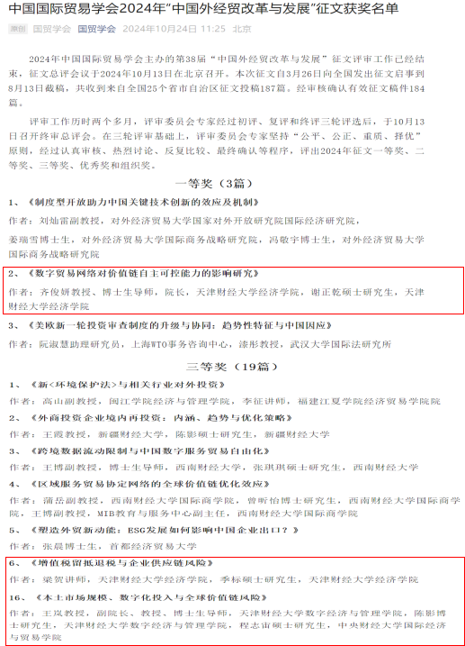 2024年11月22-23日,中国国际贸易学会年会暨国际贸易发展论坛在对外经济贸易大学隆重举行。本届年会以“建设更高水平开放型经济新体制”为主题,并进行了2024年中国国际贸易学会“中国外经贸发展与改革”征文的颁奖仪式。本年度征文活动共收到来自全国各省、自治区、直辖市征文投稿184篇,共评出论文一等奖3篇,二等奖6篇,三等奖19篇。赏金猎人App
