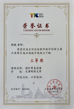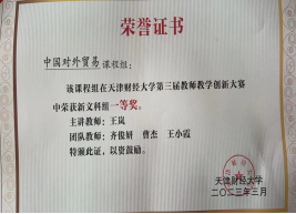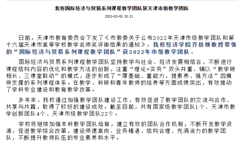 积极参与申报“数字+” 校级重点建设课程6项,并以数字技术和实体经济深度融合为发展方向,升级迭代传统课程,努力建设数字化、智能化、网络化的“数字+”课程。同时积极申报天津市重点教改项目《数字经济背景下国际贸易专业数智化教学新模式的探索与实践研究》和一般项目《一流专业建设背景下国际商务人才新技术素养提升研究》,并及时应用于课程和专业建设。截止目前,《国际贸易理论与实务》课程获批国家一流线上课程,《宏观经济学》、《国际贸易与实务》等四门课程获批天津市一流课程和天津市创新创业教育特色示范课程。《中国对外贸易》等十余项课程获批校级重点课程。“国际贸易实务技能拓展实践基地”等多项教学改革和产学研项目获得教育部立项。主持的“服务开放型经济、政产学研互动的国际经贸类研究生人才培养模式探索与实践”获得天津市教学成果二等奖。同时积极组织教师参加教学大赛,王岚、王维薇、刘欣等教师在天津市教学创新大赛中分别获得二等奖和三等奖。注重人才梯队和培养,在已有教育部新世纪优秀人才支持计划、天津市131创新型人才第1、2、3层次和天津市学科领军人才等基础上,杨勃、曹清峰、赵文涛3位青年教师入选赏金猎人App