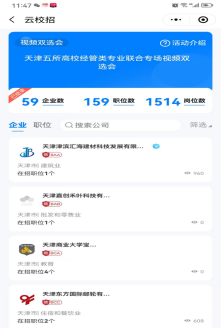 开展“天津五所高校经管类专业联合专场视频双选会”,共有57家企业参加,提供154个职位和1533个岗位数。