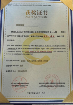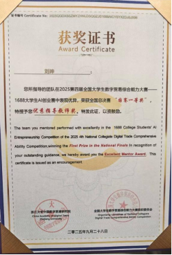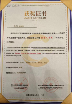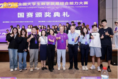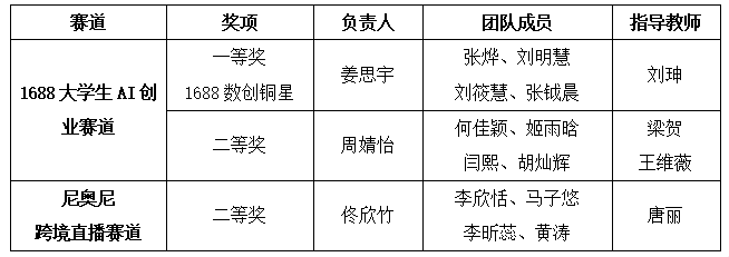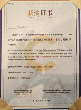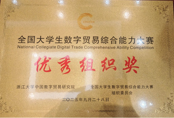 全国大学生数字贸易综合能力大赛由浙江大学中国数字贸易研究院主办,已连续成功举办四届,累计吸引1213所高校、60000余名师生参与。本届大赛中1688大学生AI创业赛道共有240所院校的1198支团队参赛,姜思宇5名同学组成的“呱唧呱唧”队获该赛道一等奖1688数创铜星;由周婧怡5名同学组成的TradeFlux获该赛道等奖。尼奥尼跨境直播赛道共有177所院校的661支团队参赛,佟欣竹5名同学组成的DDL战神获该赛道二等奖。经济赏金猎人App 教师刘珅获优秀指导师奖。